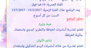 جمعيةالنهضة- مركز الفنون: برنامج للفتيات ( خياطة – فن تشكيلي – طبخ – تزيين حلويات) 14 سنة فما فوق للتسجيل: 042662737 تحويلة 233 – 234 – 251 0566279363