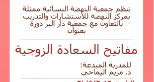 تنظم جمعية النهضة النسائية ممثلة بمركز النهضة للاستشارات والتدريب بالتعاون مع جمعية دار البر دورة بعنوان “مفاتيح السعادة الزوجية” للمدربة المبدعة الدكتورة مريم اليماحي التاريخ: غداً الأربعاء 21/9/2016 الوقت: 10:30 صباحاً المكان: جمعية دار البر الفرع الرئيسي شارع الشيخ زايد الحضور مجاناً للسيدات فقط وستوزع شهادات مشاركة للحضور
