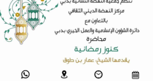 نظمت جمعية النهضة النسائية بدبي- مركز النهضة الديني الثقافي بالتعاون مع دائرة الشؤون الإسلامية والعمل الخيري بدبي محاضرة بعنوان( كنوز رمضانية ) ضمن فعاليات { مهرجان رمضان} ، قدمها الشيخ: عمار بن طوق المري، الواعظ بدائرة الشؤون الإسلامية والعمل الخيري، وذلك يوم الاثنين الـ 18 من رمضان، الموافق 11/5/2020. تم …