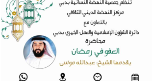 يدعوكم مركز النهضة الديني الثقافي بجمعية النهضة النسائية، وبالتعاون مع دائرة الشؤون الإسلامية والعمل الخيري بدبي لحضور محاضرة بعنوان ” العفو في رمضان” يقدمها الشيخ /عبدالله موسى ، عبر تطبيق زووم 🗓 يوم الأربعاء 6/5/2020 ⏰ في تمام الساعة 10 مساءً